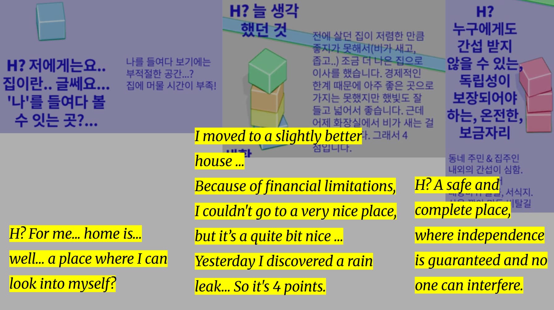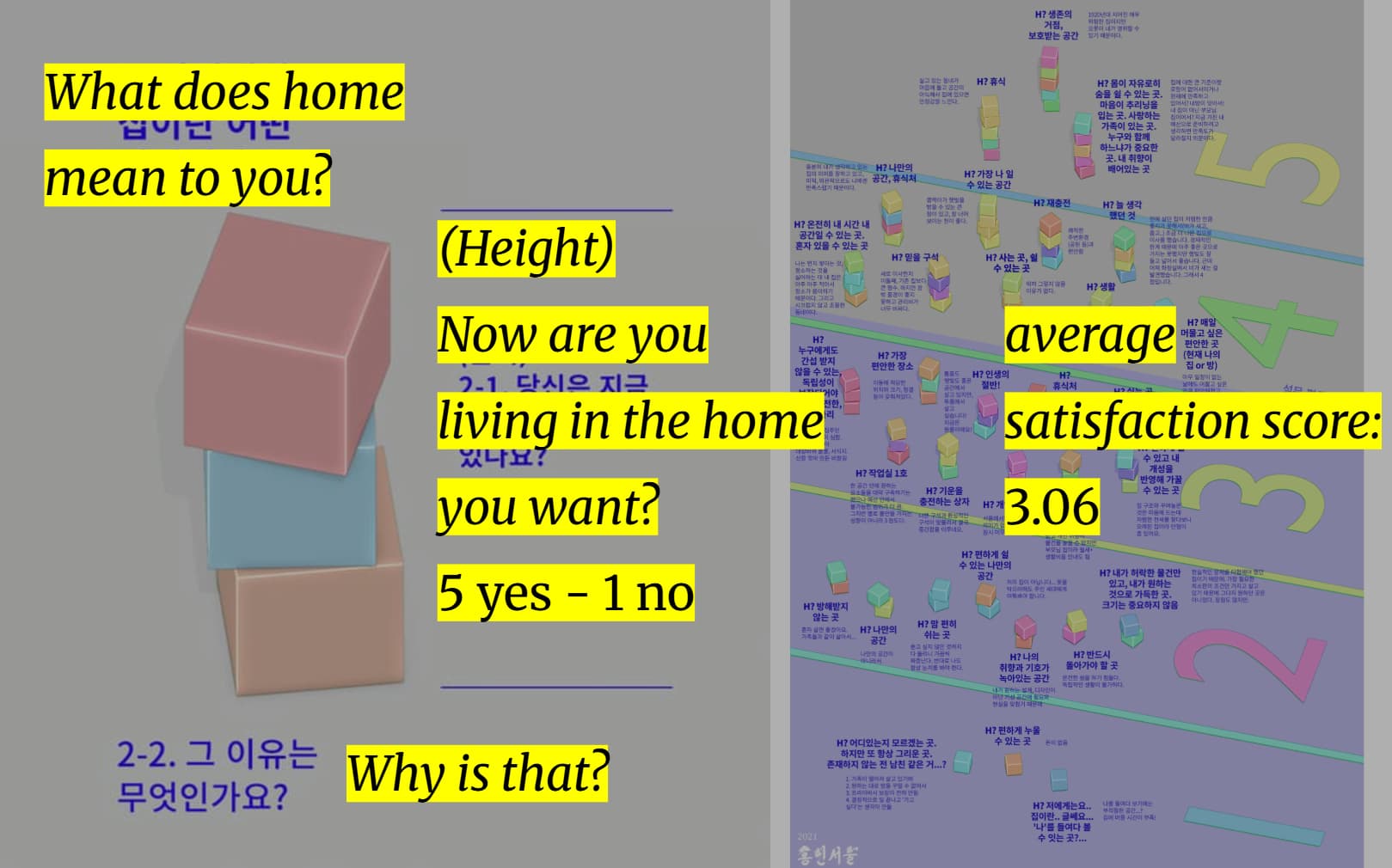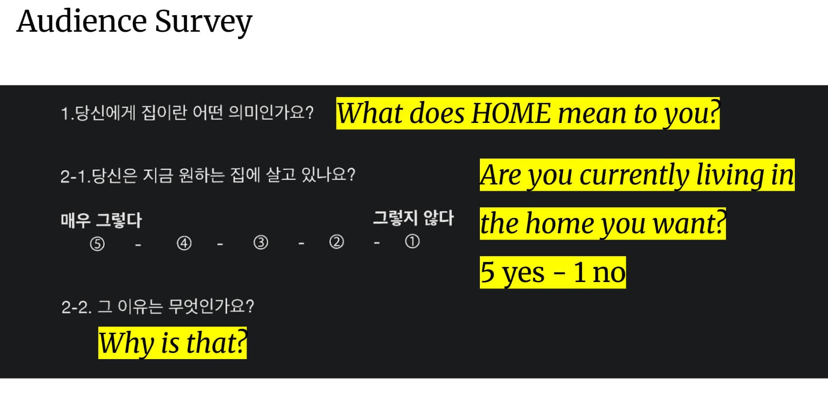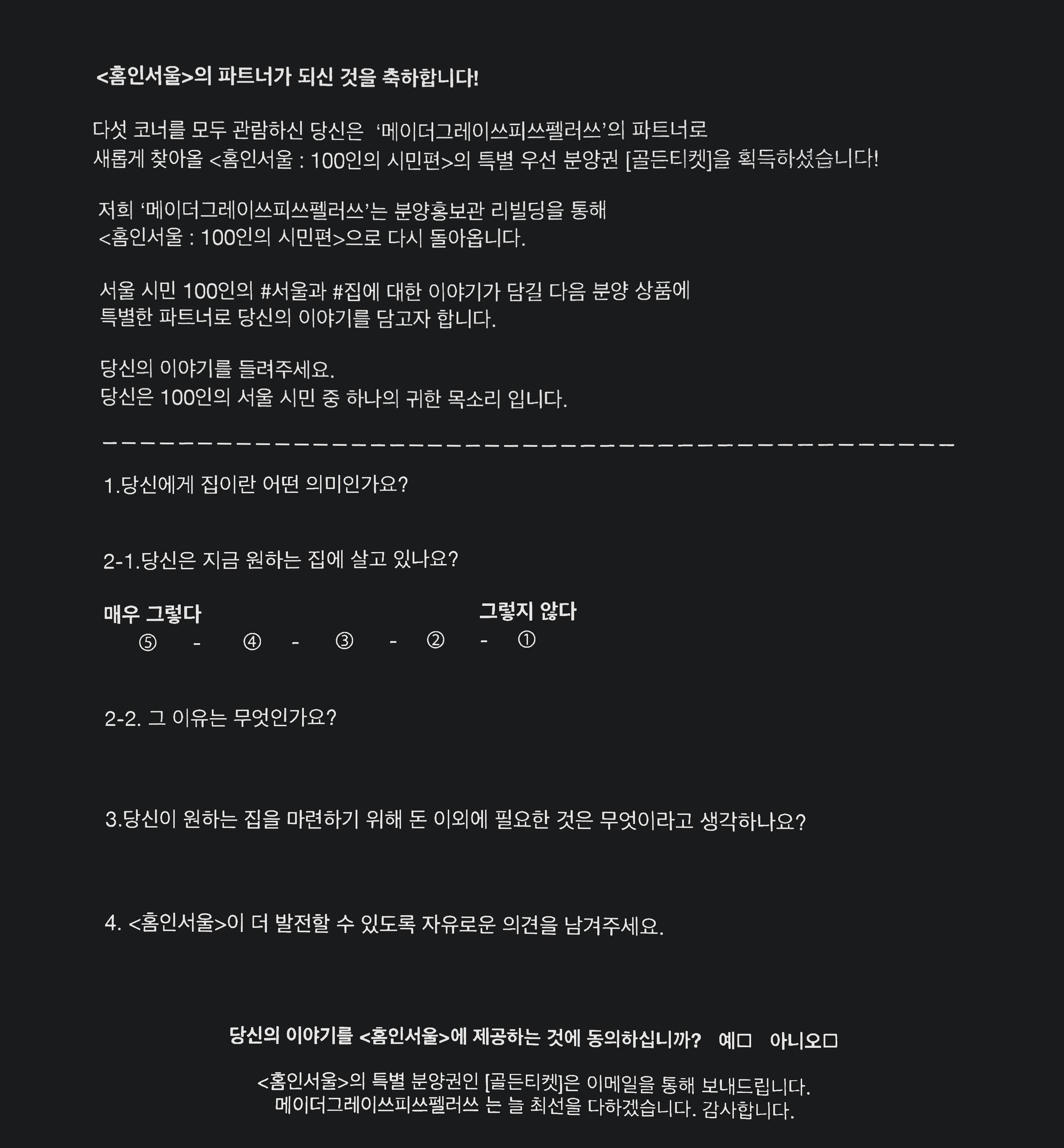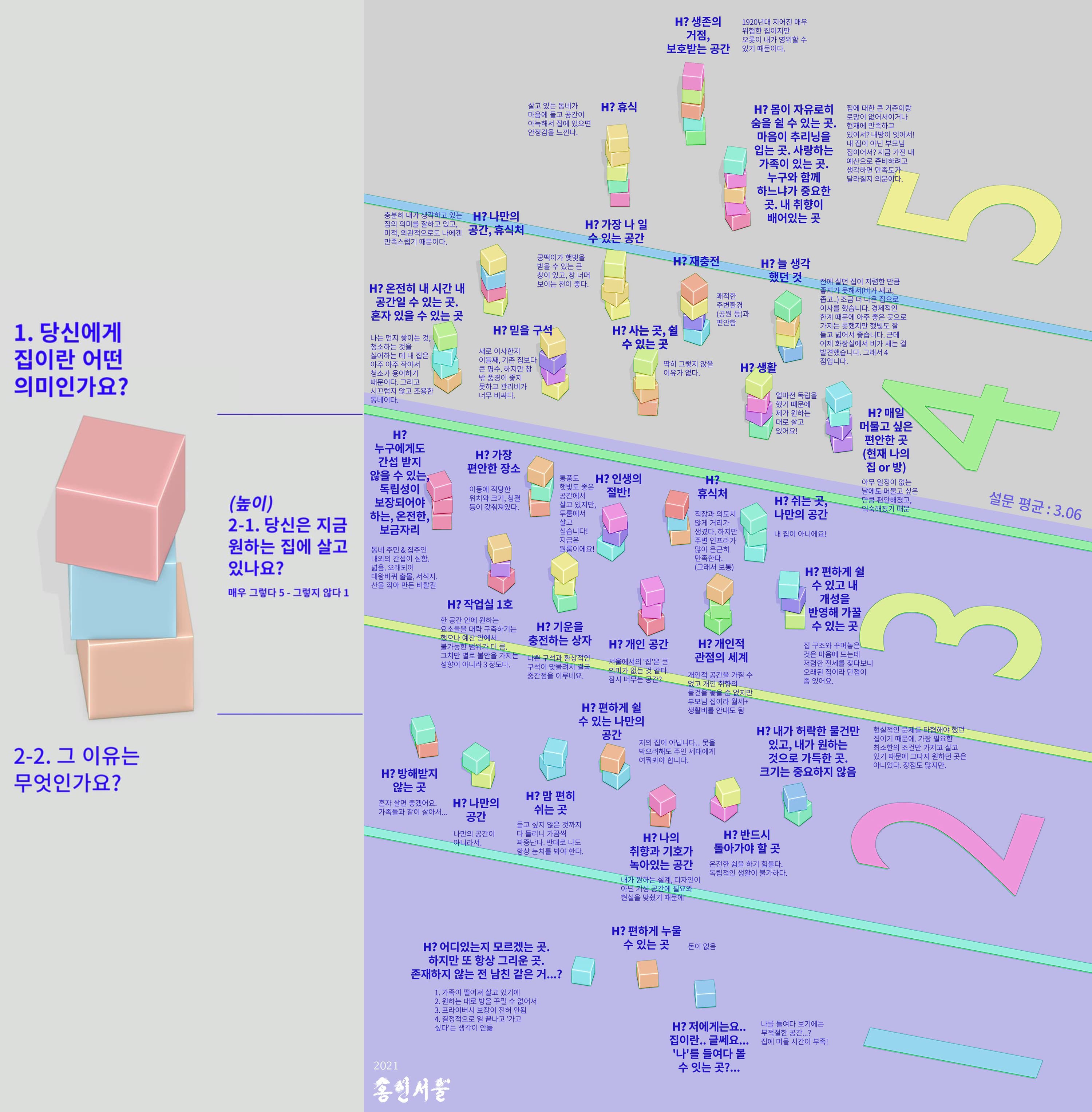 프로젝트 <홈 인 서울>은 결과 전시와 관객 설문 조사를 통해 그 의미가 확장되었다. 전시 현장에서 관객들은 “당신에게 집은 어떤 의미인가요?”라는 질문에 응답하며, 각자의 경험과 바람을 직접 언어화했다. 이 과정에서 집은 고정된 정의가 아니라, 타인의 응답과 나의 응답이 서로 반사되고 겹쳐지며 끊임없이 새롭게 구성되는 문제로 드러났다.