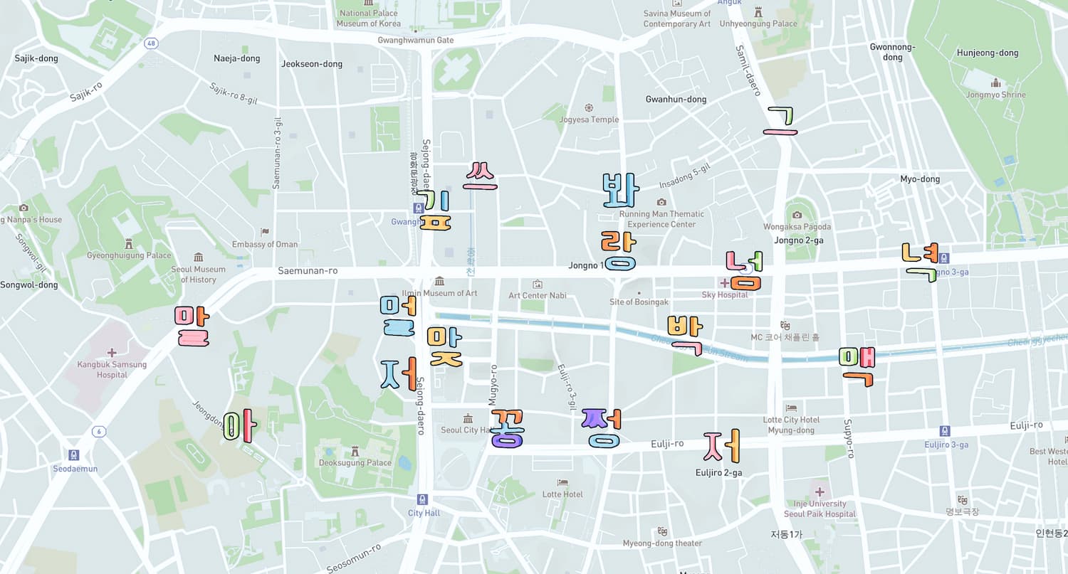 도시적 커뮤니티와 소통의 한계를 놀이적 인터랙션으로 전환하고자, 관객이 입력한 문장을 한글 기호로 변환해 새로운 사인으로 재구성하는 알고리즘과, 이를 증강현실 환경 속에 배치할 수 있는 인터페이스를 구상했다.