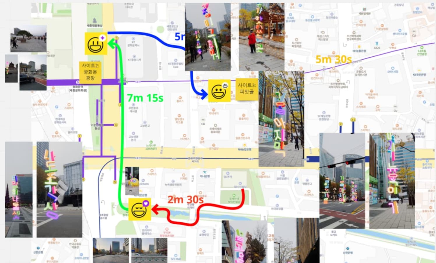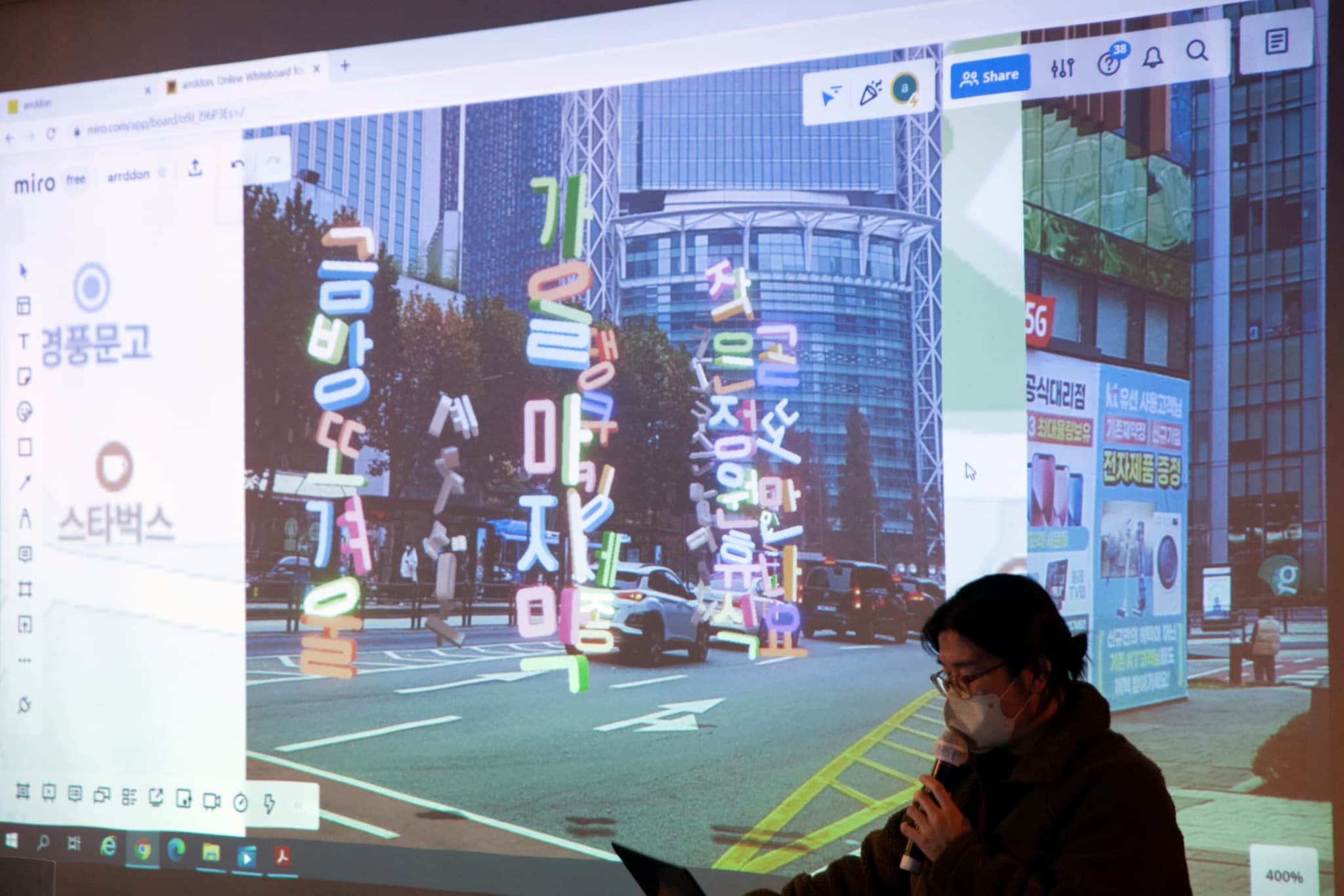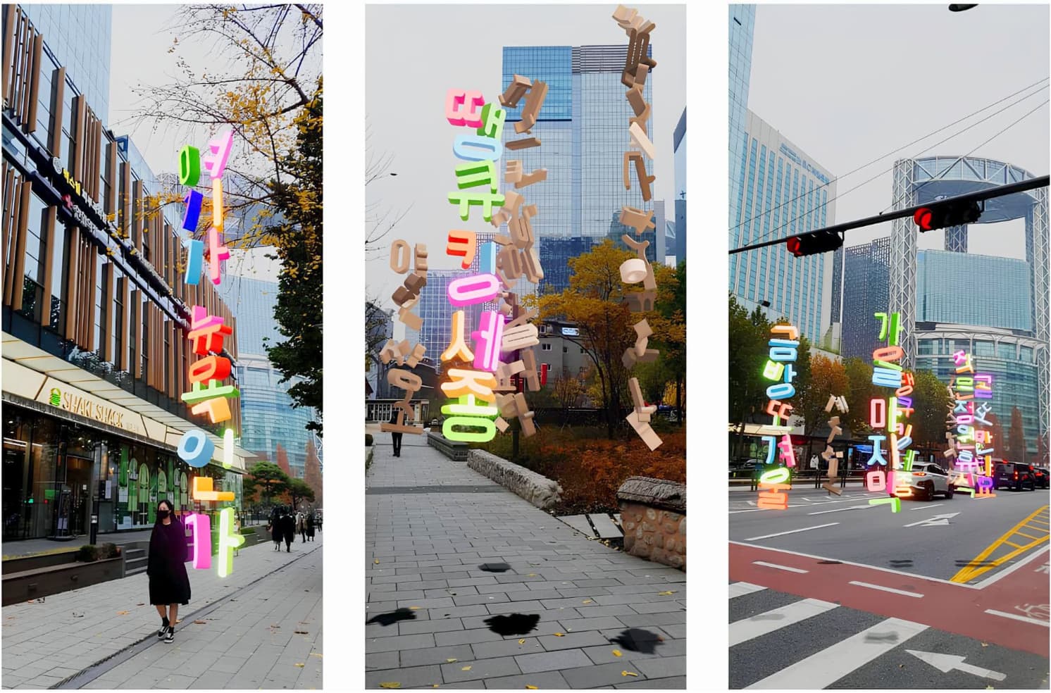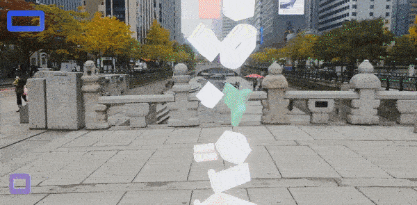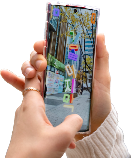 Through the play, viewers input sentences containing their own voices, converted into Korean symbols, and created digital signs, which they then placed or shared within the AR environment. This project transforms the process of urban and media communication into play, exploring the potential for individual messages to be communicated in new ways within a community.