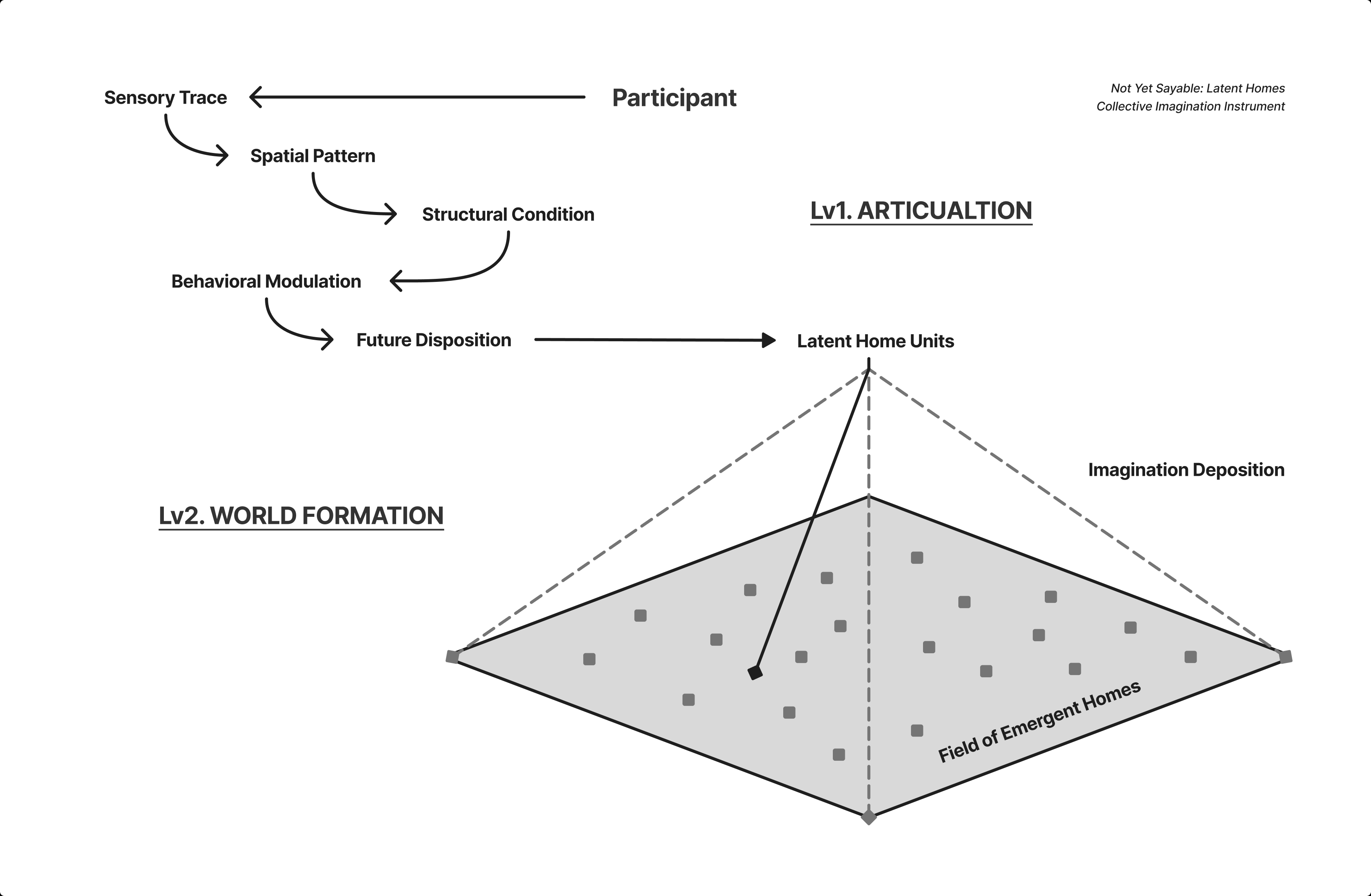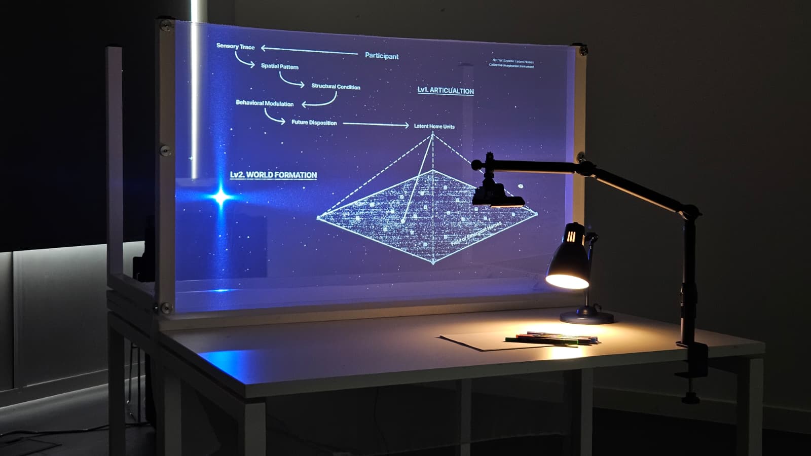Not Yet Sayable: Latent Homes begins from a different premise: imagination has not disappeared, but remains latent within everyday life. Participants articulate fragments of their lived experiences of home, which are translated through an artist-designed system into evolving spatial formations. Through this process, individual traces accumulate to form a collective spatial field where new imaginaries of dwelling can emerge.