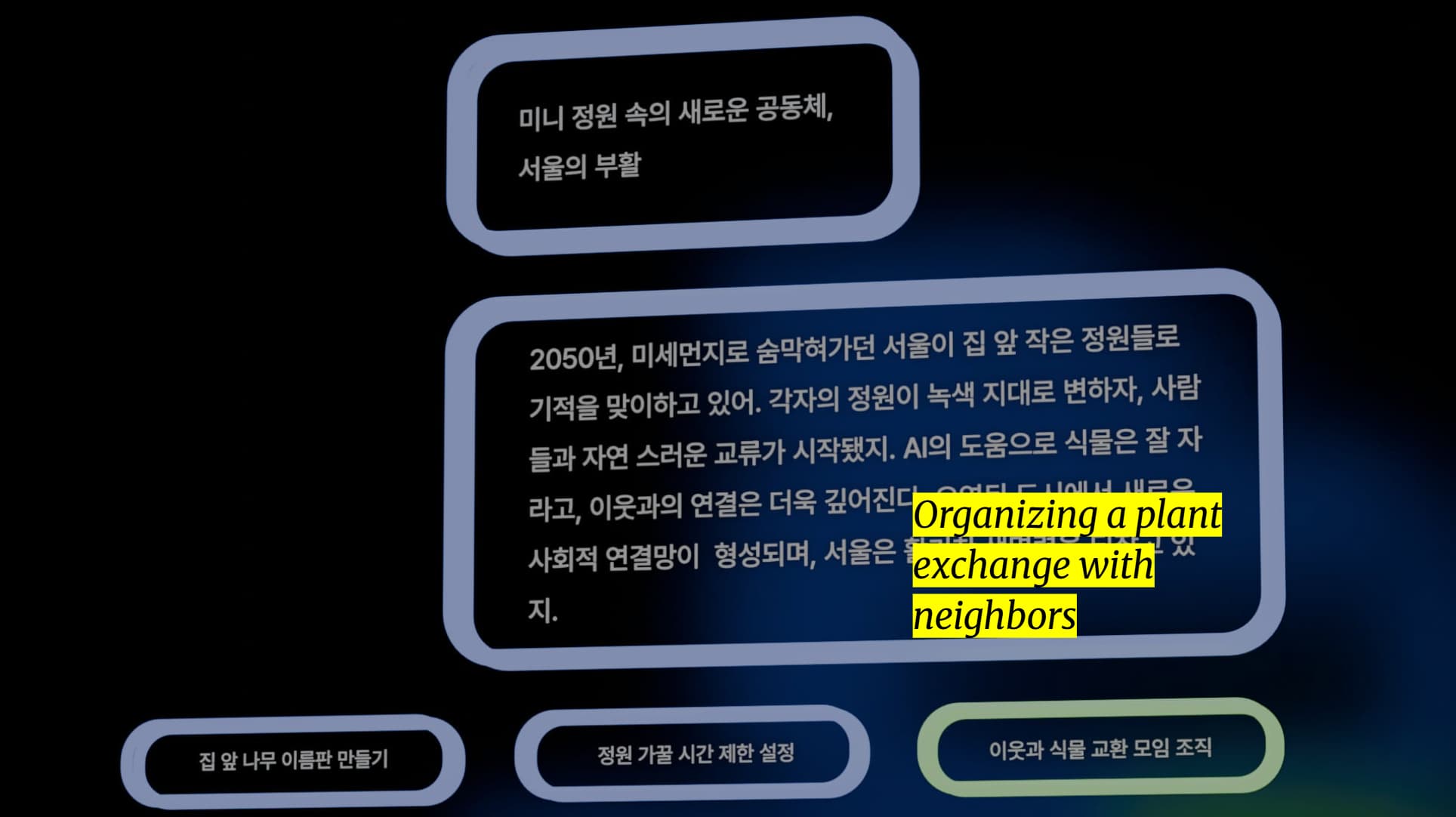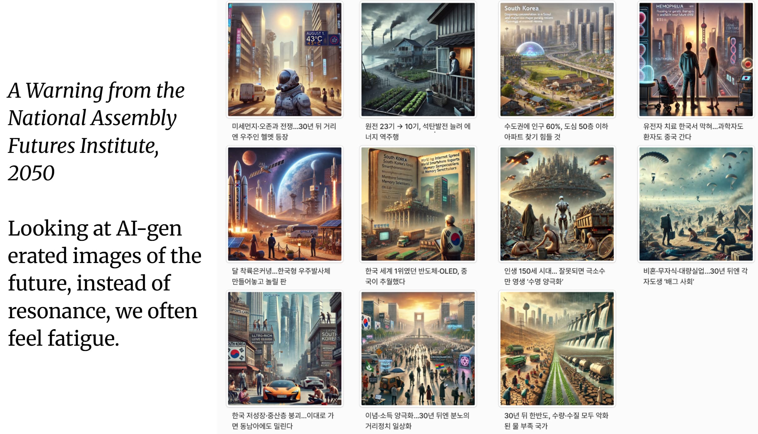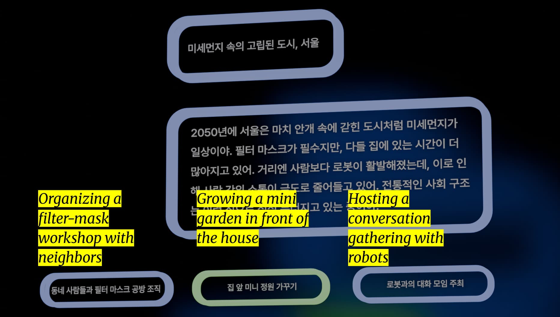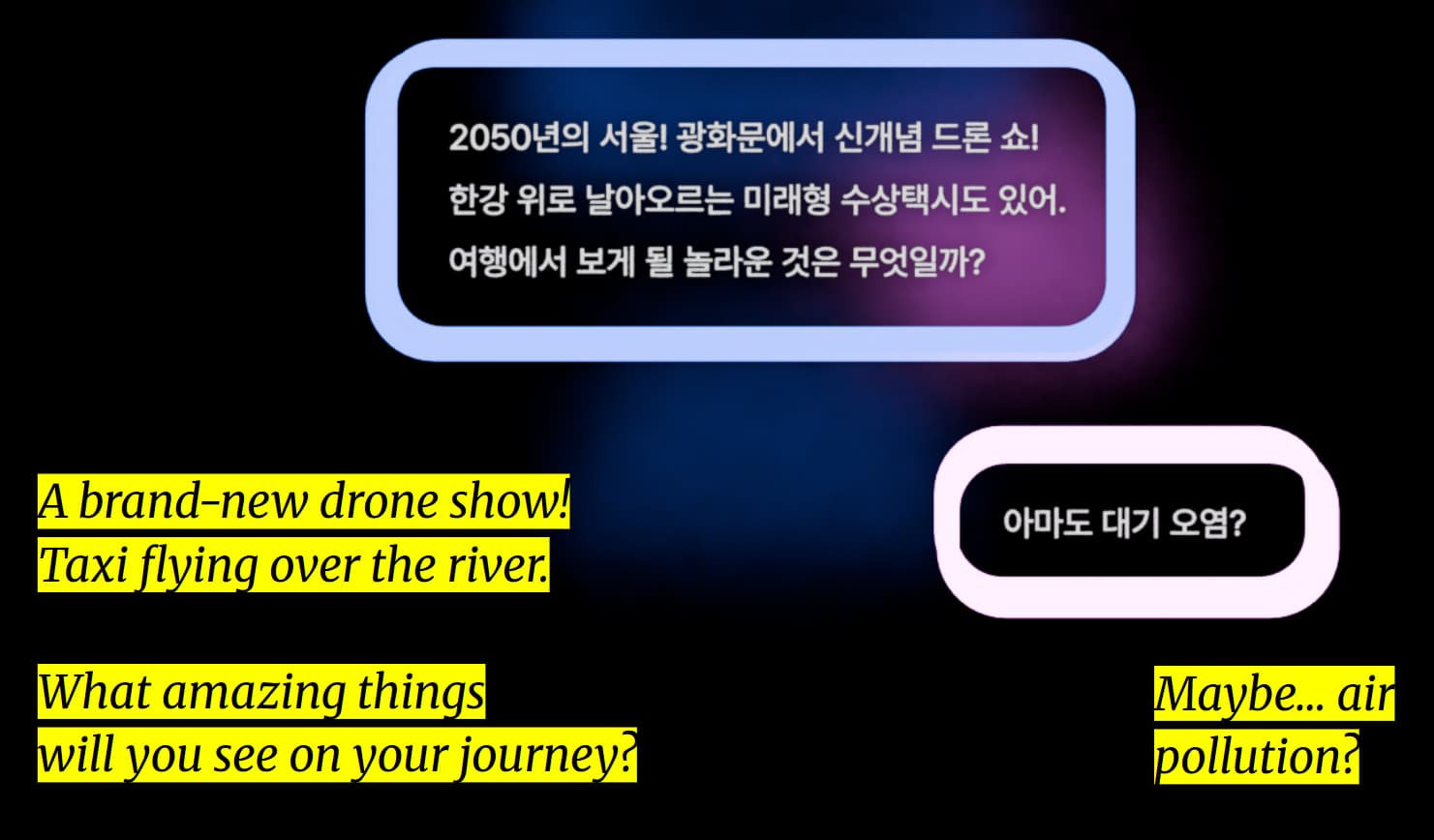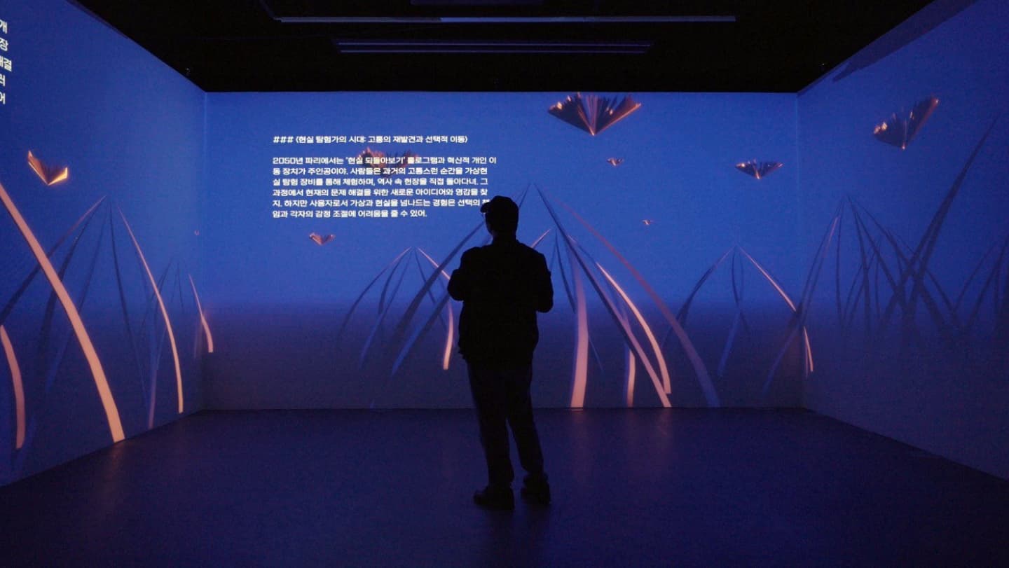 미래에 대한 우리의 상상은 종종 막연하고 불확실하다. AI가 만들어내는 이미지는 비전을 제시하지만, 공감보다는 피로감을 주기도 한다. 프로젝트를 통해 관객을 가상의 미래 속으로 직접 끌어들여, 수행적이고 체험적인 방식으로 집단적 상상력을 가시화했다.